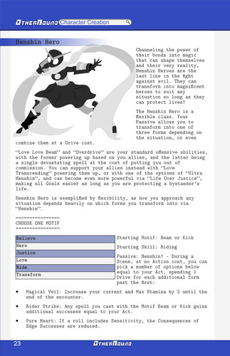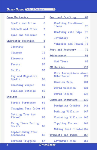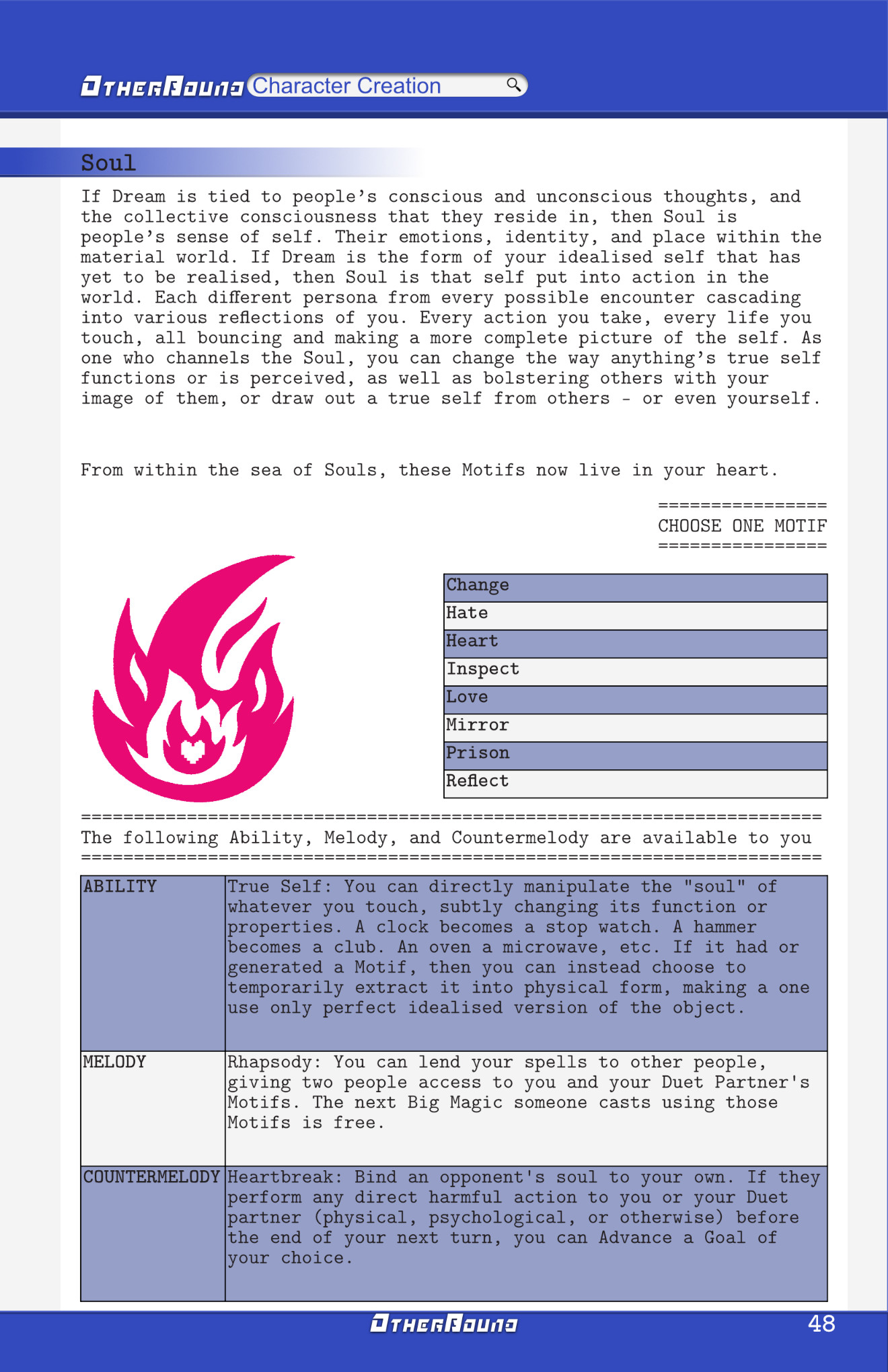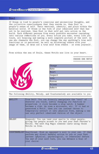 OtherBound is made using the Harmony Drive SRD, based off of the game Heroic Chord by Peach Garden Games. It features Harmony Drive's spell piece system reworked as Motifs, a free-form magic system that allows you to improvise spells by combining simple words from yourself and the world around you! Beyond that it also includes: